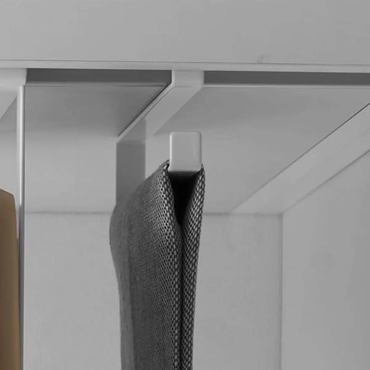 キッチンの吊り戸棚の棚板に差し込むだけで簡単に設置できるタオルハンガーです。