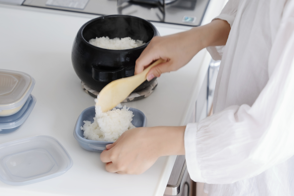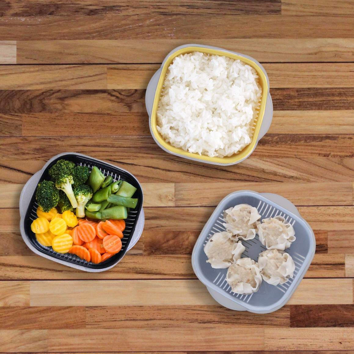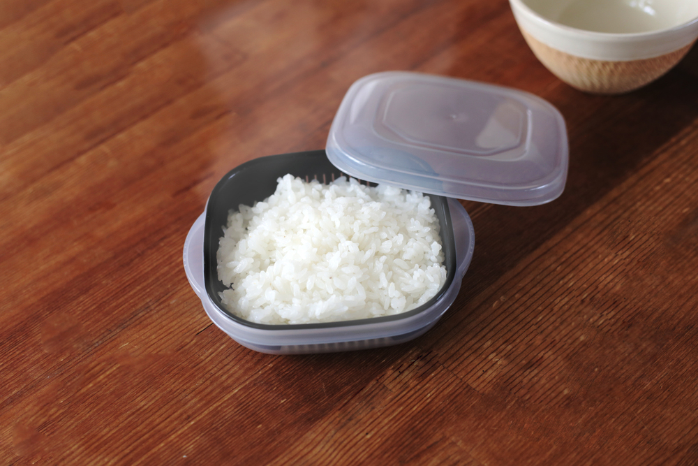 ご飯を一善分入れてそのまま冷凍保存でき、電子レンジでチンするだけで、ざるの効果で蒸し器のようにふっくらご飯に仕上げます。