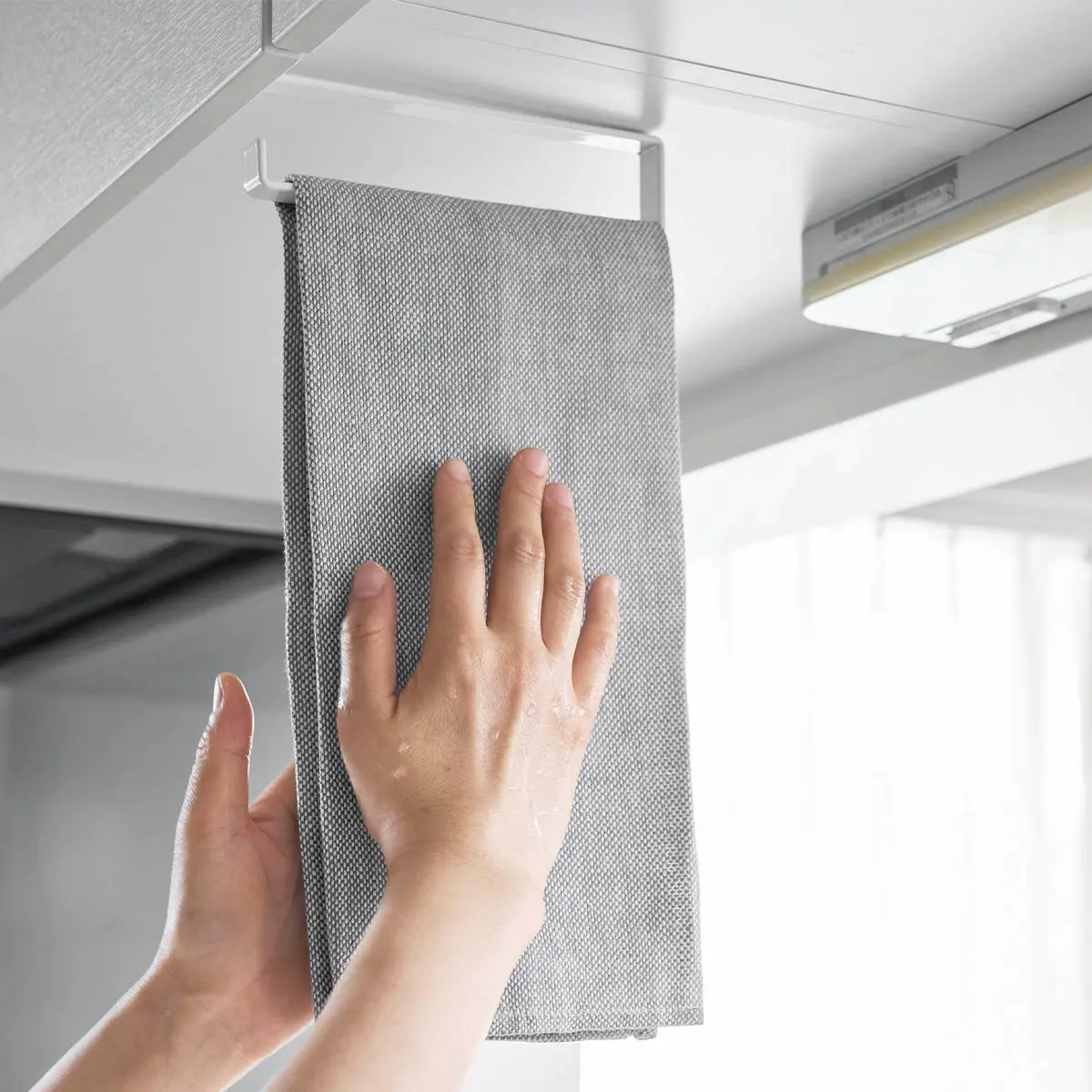 頭上にタオルを設置できるので、かがまず自然な姿勢のままサッと手が拭けます。